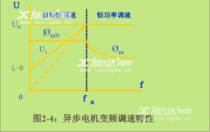 基頻以下(恒轉(zhuǎn)矩調(diào)速):當(dāng)頻率較低時(shí)認(rèn)為定子相電壓U≈E,要使?不變則:U/f=常數(shù)即可。低頻時(shí)U和E都較小,定子繞組阻抗不能再忽略,這時(shí)可將電壓U抬高一些以補(bǔ)償定子電壓,基頻以下控制屬于“恒轉(zhuǎn)矩調(diào)速”。 基頻以上控制(恒功率調(diào)速):基頻以上調(diào)速時(shí)電壓U不能超過(guò)額定壓Un,最多只能保持在額定電壓Un。頻率上升電壓不變將使磁動(dòng)勢(shì)減弱、轉(zhuǎn)矩減小,但由于同步轉(zhuǎn)速上升可認(rèn)為輸出功率基本不變。故基頻以上變頻調(diào)速屬于“弱磁恒功率調(diào)速”(見(jiàn)圖2-4)。