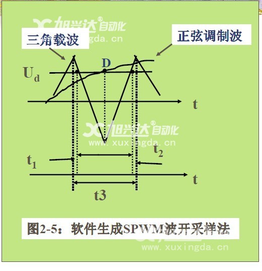 主要有四種方法:脈寬PWM法、正弦波PWM法(SPWM)、磁鏈追蹤PWM法、電流跟蹤PWM法,通用型變頻器大多采用SPWM法逆變器的輸出波形為一系列等幅不等寬的矩形脈沖波形,這些脈沖波形與正弦波等效。軟件控制法:表格法、自然采樣法、規(guī)則采樣法(見(jiàn)圖2-5)。