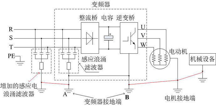 為了避免這個問題的發(fā)生,變頻器硬件在設(shè)計的時候,就加入了感應(yīng)電浪涌濾波器電路(其等效電路如圖1所示),并將感應(yīng)浪涌濾波器的接地端與變頻器的外殼相連,同時在變頻器的配線說明中,要求將電機的接地端與變頻器的接地端子B相連、將輸入電源的地(即大地)與變頻器的接地端子A相連。