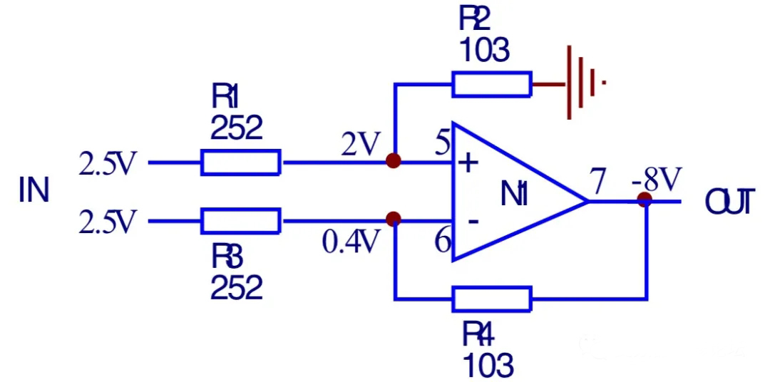 2、進(jìn)一步分析,此時(shí)由于同相輸入端的分壓電路異常,導(dǎo)致原差分放大器的“輸出虛地”條件被破壞,如圖5所示。故使輸出電壓由0V上升為2.5V。