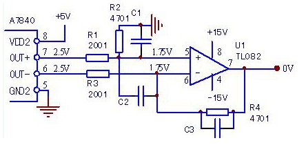 現(xiàn)測U1的輸入、輸出端電壓均為2.5V,判斷U1是好的,故障為U1偏置電路或A7840異常所致。測A7840的6、7腳輸出電壓均為2.5V,正常。故障局限于R1、R2分壓電路異常,如R2虛焊或斷路,將導致2.5V的故障電壓輸出。