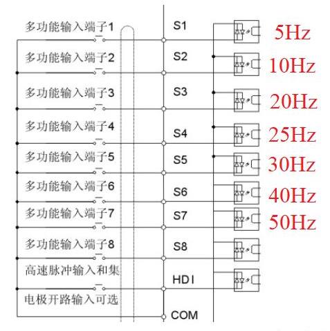 通過設(shè)定多端速端子的組合來選擇當(dāng)前運行的頻率,也就是使用開關(guān)量來選擇不同的頻率,在相應(yīng)的開關(guān)上設(shè)置頻率,這樣變頻器就可以以多段速方式加減速,例如英威騰的: