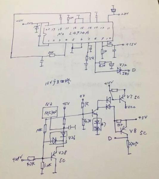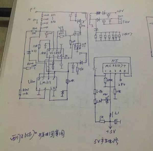 這是電源草圖,電源電路采用傳統(tǒng)的UC3844作為震蕩芯片,產(chǎn)生28V和風(fēng)扇電壓輸出。N5為MC33167 產(chǎn)生5V的工作電壓。開關(guān)電源比較簡單。