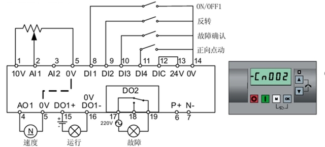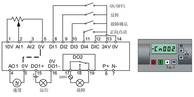3. 通常端子控制,需要外接指示燈來確認(rèn)變頻器狀態(tài),當(dāng)DO2輸出故障時(shí),解除故障可通過DI3端子復(fù)位(故障未消除情況下無效)。