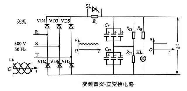 3)短路開(kāi)關(guān)SL的作用是:如果限流電阻RL長(zhǎng)期接在電路內(nèi),會(huì)影響直流電壓UD和變頻器輸出電壓的大小。所以,當(dāng)UD增大到一定程度時(shí),令短路開(kāi)關(guān)SL接通,把RL切出電路。SL大多由晶閘管構(gòu)成,在容量較小的變頻器中常由繼電器的觸點(diǎn)構(gòu)成。