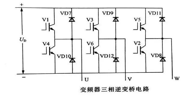 逆變橋電路的功能是把直流電轉(zhuǎn)換成三相交流電。逆變橋電路由下圖中的開(kāi)關(guān)器件 V1~V6 構(gòu)成。目前中、小容量的變頻器中,開(kāi)關(guān)器件大部分使用IGBT 管。