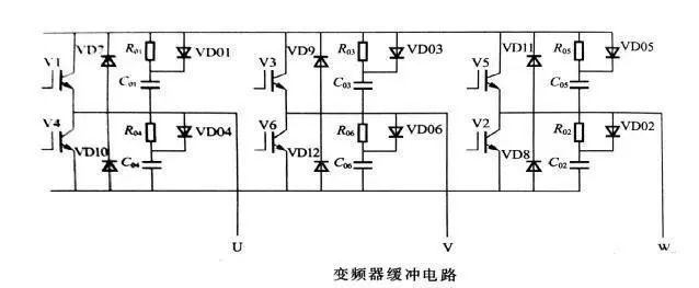 逆變管在關(guān)斷和導(dǎo)通的瞬間,其電壓和電流的變化率是很大的,有可能使逆變管受到損害。因此,每個(gè)逆變管旁還應(yīng)接入緩沖電路,以減緩電壓和電流的變化率。緩沖電路的結(jié)構(gòu)因逆變管的特性和容量等的不同而有較大差異,下圖所示的是比較典型的一種緩沖電路(由R01~R06、C01~C06、VD01~VD06構(gòu)成)。