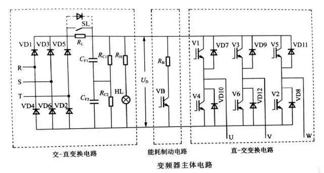 不同系列交-直-交變頻器內(nèi)部的主體電路基本相同,變頻調(diào)速過(guò)程中出現(xiàn)的許多現(xiàn)象都可通過(guò)主體電路來(lái)進(jìn)行分析。