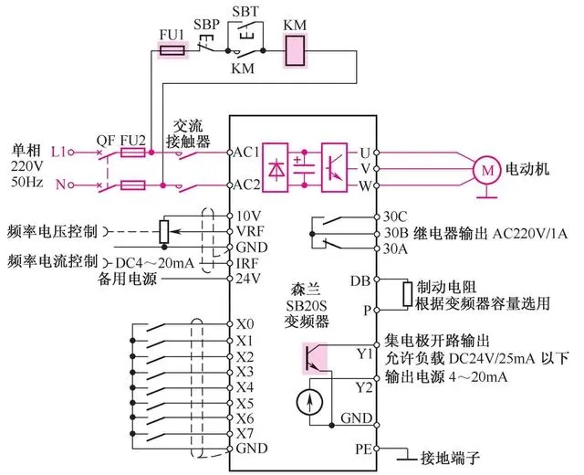 轉(zhuǎn)速上升/轉(zhuǎn)速下降可通過并聯(lián)開關(guān)來實現(xiàn)在不同的地點控制同一臺電動機運行, 由X4、 X5端的狀態(tài) (開關(guān)SB1、 SB2) 確定, 虛線即為設(shè)在不同地點的控制開關(guān)。