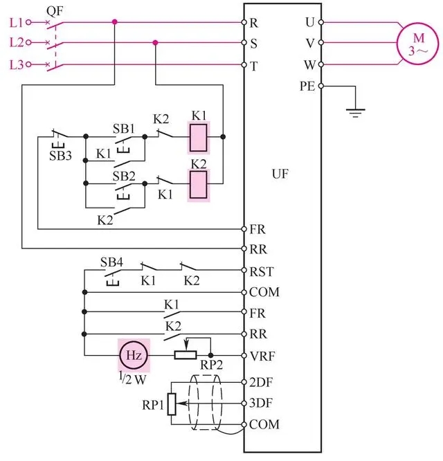 正轉(zhuǎn)時, 按下按鈕SB1, 繼電器K1得電吸合并自鎖, 其常開觸點閉合, FR-COM連接, 電動機正轉(zhuǎn)運行;停止時, 按下按鈕SB3, K1失電釋放, 電動機停止。