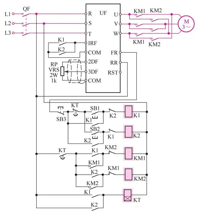 RP為頻率給定電位器, 須用屏蔽線連接。 時間繼電器KT的整定時間要超過電動機停止時間或變頻器的減速時間。 在正轉(zhuǎn)或反轉(zhuǎn)運行中, 不可關(guān)斷接觸器KM1或KM2。