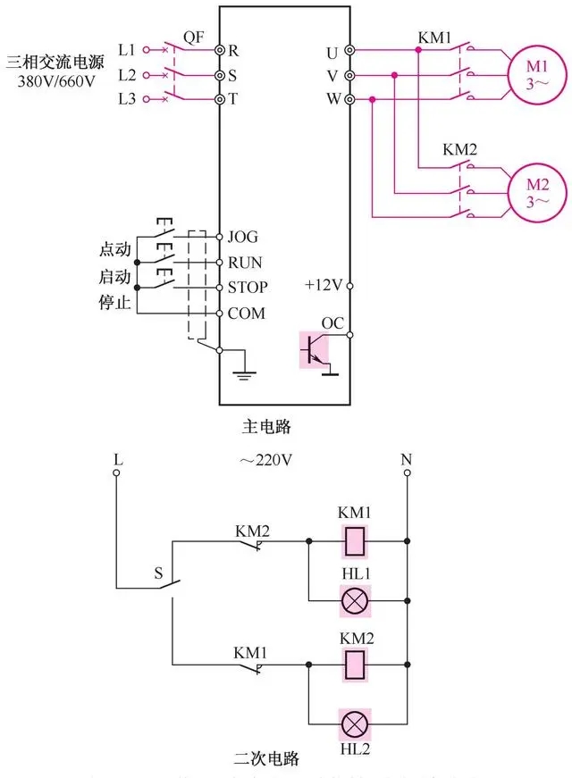 按下二次電路中的SB1、 SB3則M1、 M2停止運行。