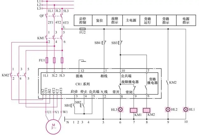 CR1-30~CR1-450電動機軟啟動器線路如圖4-11所示。 圖中QF為斷路器;FU1為快速熔斷器;KM1、 KM2為交流接觸器, 其中KM2為旁路接觸器;SB1為啟動按鈕, SB2為軟停按鈕, SB3為電動機急停按鈕, SB4為控制電源復(fù)位按鈕;HL1為電源指示燈, HL2為旁路指示燈, HL3為故障指示燈。