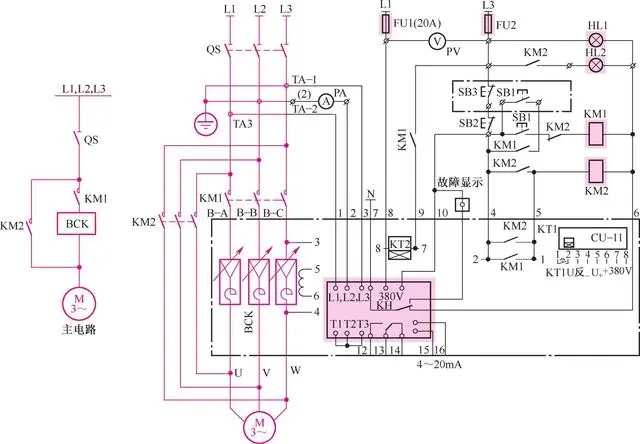 BCK箔式繞組磁控式電動機軟啟動器是一種交流異步電動機軟啟動裝置, 可減輕電動機啟動時對電網(wǎng)的沖擊擾動, 降低對電網(wǎng)容量的要求。 它采用繼電器、 可編程序控制器 (PLC) 或單片機控制系統(tǒng),實現(xiàn)對異步電動機啟動過程和運行方式的手動與自動集中和就地控制,具有低耗節(jié)能、 適應(yīng)重載啟動等優(yōu)點。 BCK箔式繞組磁控式電動機軟啟動器線路如圖4-10所示。