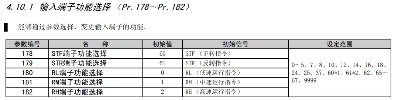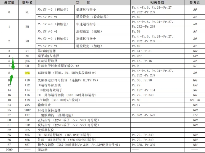 第一步:15段速要使用4個端子作為信號,所以必須要更改STR,STF其中一個端子作為調(diào)速的信號,我們稱這個虛擬端子為REX,找到Pr.178~Pr.182參數(shù)型號,這里選擇修改STR端子。找到Pr.179參數(shù),進(jìn)入后參數(shù)設(shè)置為 "8" 。PS:有些變頻器在Pr.160在往上調(diào)就回到了起點(diǎn),沒有后面的參數(shù)號,這里可以把Pr.160里面的參數(shù)改為“0”即可(初始值9999)。