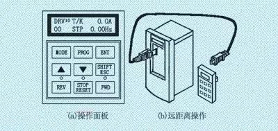 和頻率給定方式類似, 變頻器操作指令的輸入方式也有: (1) 鍵盤操作 即通過面板上的鍵盤輸入操作指令。大多數(shù)變頻器的面板都可以取下, 安置到操作方便的地方, 面板和變頻器之間用延長線相聯(lián)接, 從而實(shí)現(xiàn)了距離較遠(yuǎn)的控制, 如圖1所示。