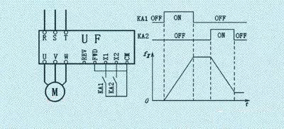 當(dāng)KA1閉合時,X1得到信號,變頻器的輸出頻率上升;KA1斷開時,輸出頻率保持(如需要,也可以不保持)。