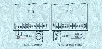 利用外接升、降速控制信號對變頻器進(jìn)行頻率給定時,屬于數(shù)字量給定,控制精度較高。 (2) 應(yīng)用舉例 (a)代替外接電位器給定 在變頻器的外接給定方式中,人們習(xí)慣于使用電位器來進(jìn)行頻率給定,如圖4(a)所示。