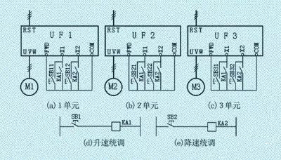 按下SB1,繼電器KA1得電,其觸點(diǎn)分別將各變頻器的X1-COM接通,各單元電動機(jī)同時升速;