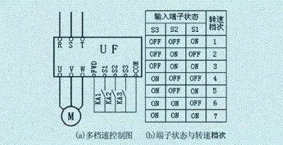 變頻器可以設(shè)定若干檔工作頻率,其頻率檔次的切換是由外接的開關(guān)器件改變輸入端子的狀態(tài)和組合來實(shí)現(xiàn)的。