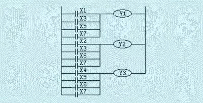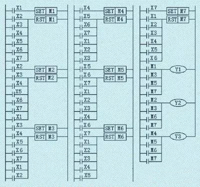 M1、M3、M5、M7中只要有一個接通,則Y1“動作”→變頻器的S1端接通; M2、M3、M6、M7中只要有一個接通,則Y2“動作”→變頻器的S2端接通; M4、M5、M6、M7中只要有一個接通,則Y3“動作”→變頻器的S3端接通。