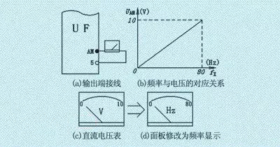 將功能碼Pr.55預(yù)置為“80”,則頻率顯示范圍為0~80Hz。AM端的輸出電壓與顯示頻率之間的對應(yīng)關(guān)系如圖15(b)所示。