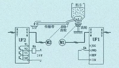 有一臺攪拌機(jī),需要和傳輸帶進(jìn)行聯(lián)動控制。攪拌機(jī)由電動機(jī)M1拖動,轉(zhuǎn)速由變頻器UF1控制;傳輸帶由電動機(jī)M2拖動,轉(zhuǎn)速由變頻器UF2控制,如圖17所示。