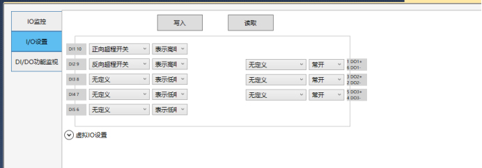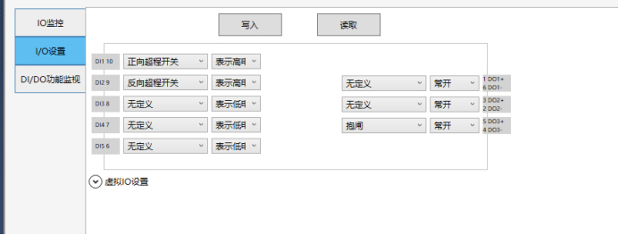 8.左側(cè)菜單欄,雙擊進入IO設置,進行IO配置(正負限位、原點(原點可能接在PLC上))