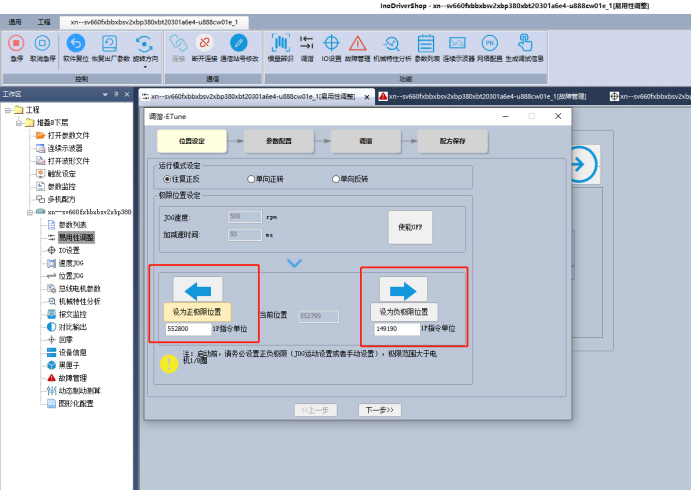 12.設置調(diào)諧正負極限位置,將伺服移至正方向調(diào)諧運動安全位置,點擊 設為正極限位置,負極限相同 (兩個位置值不必須為極限位置)