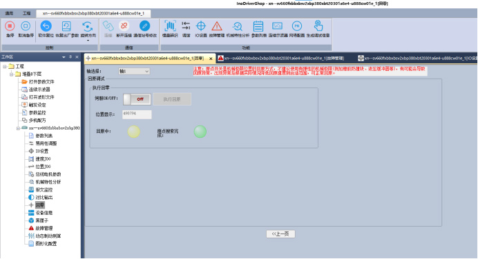 18.點擊下一頁,接通使能,執(zhí)行回原,原點搜索完成燈亮起,代表回原完成,直接關閉,不要點擊上一頁,基本配置完成