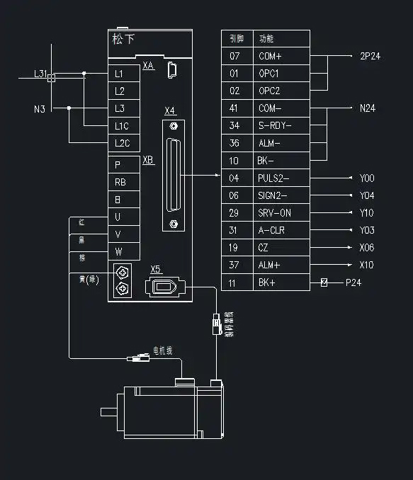 PLC輸入輸出點(diǎn) FX3U脈沖輸出模式是開路集電極方式,參照松下伺服位置控制模式馬達(dá)接線圖 松下伺服X4接線圖 規(guī)劃好IO之后,就可以設(shè)計(jì)電路圖,下圖是松下的伺服接線圖