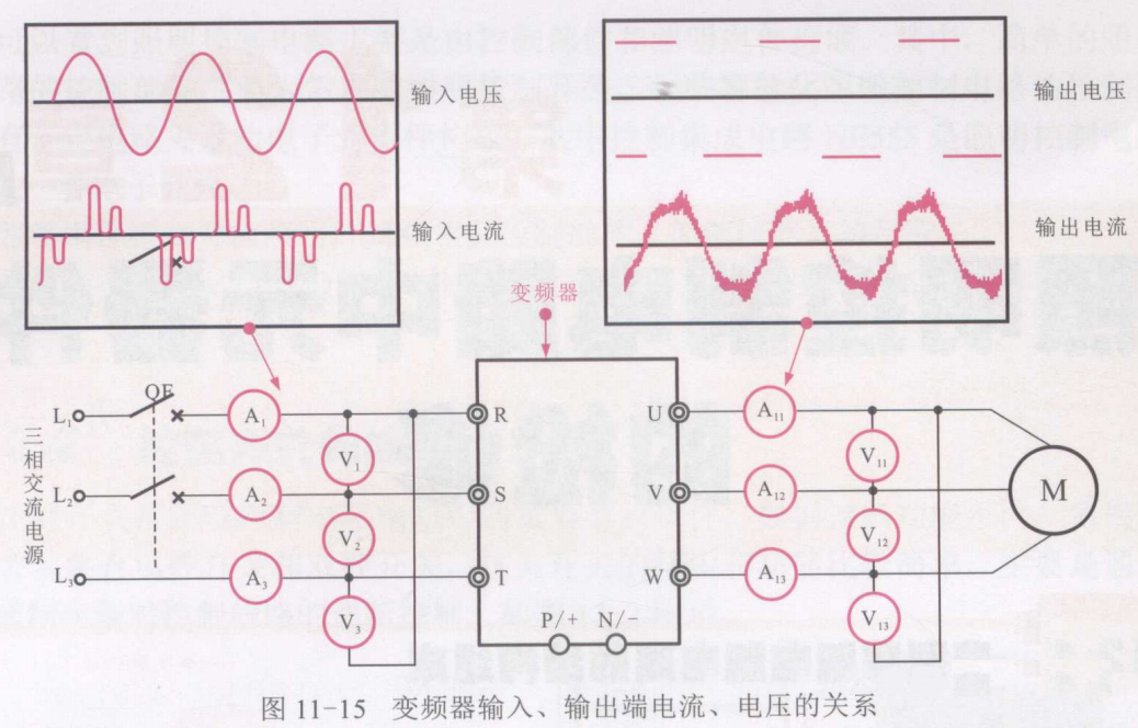 變頻器輸入、輸出端電流、電壓的關(guān)系如圖11-15所示。主要注意的是,大多變頻器本身都有故障顯示功能,通過識別其故障代碼可較直觀地了解其故障部位和原因,并針對不同的故障原因,采取相應(yīng)的檢修措施,排除故障。